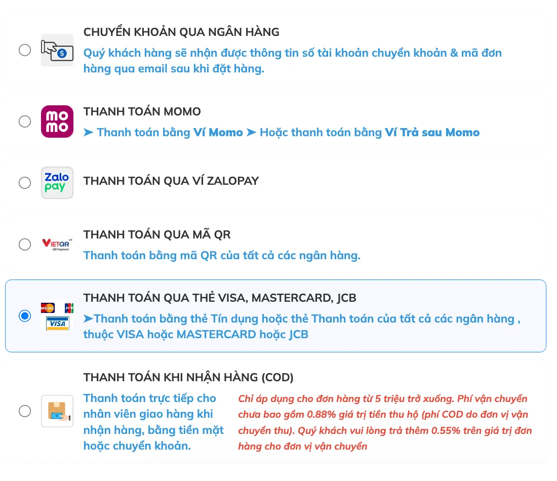 - Đơn hàng thanh toán bằng Thẻ tín dụng, khi đổi trả hàng, sẽ bị trừ tiền phí thanh toán thẻ từ 2%-4% tùy ngân hàng, tùy loại thẻ.
